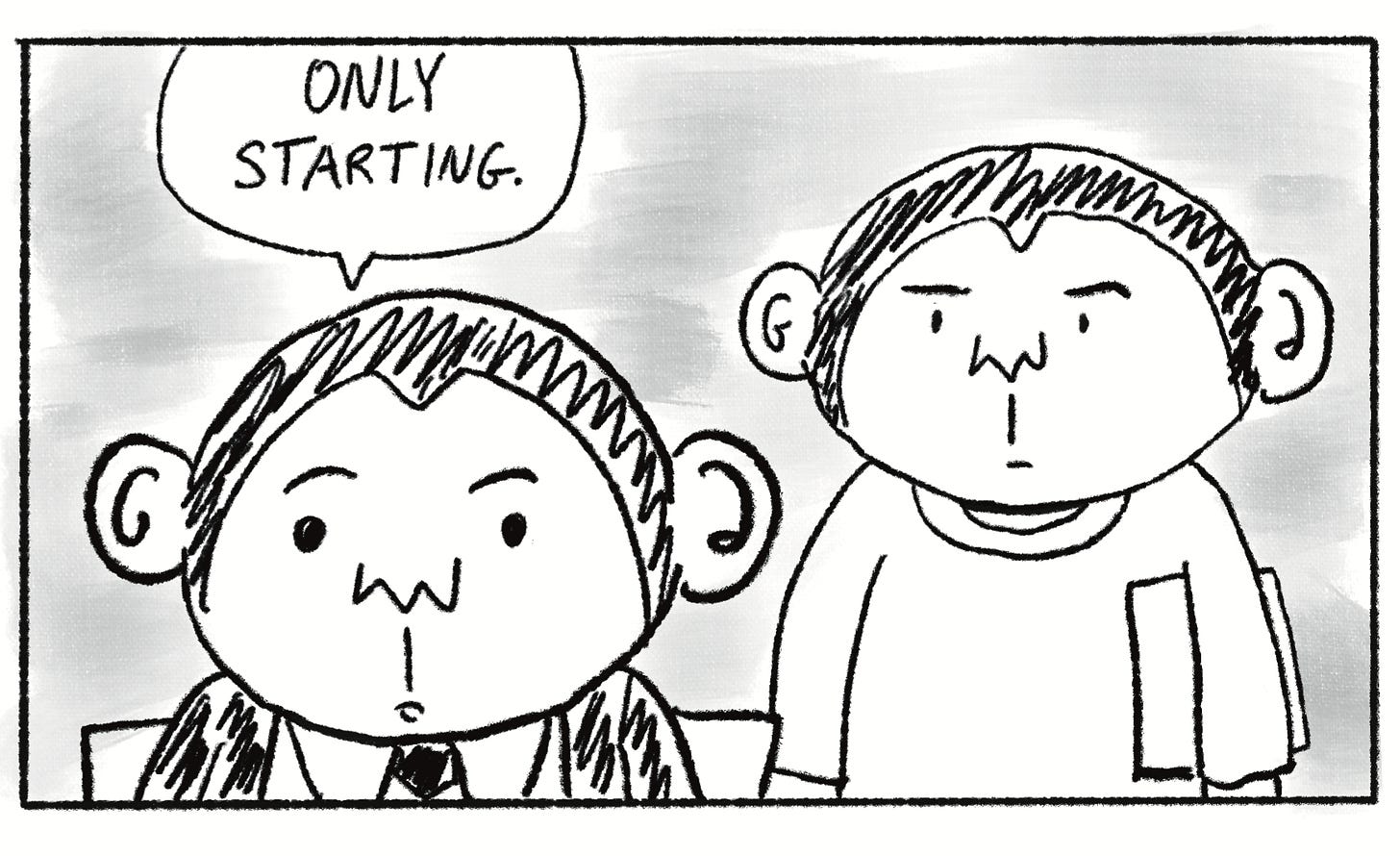 Walt stands up, grabs a 0.9 leaded pencil from a pen cup, and leans over Gloom's desk. It looks like Gloom could have just woken up from a nap, eye goop and all.