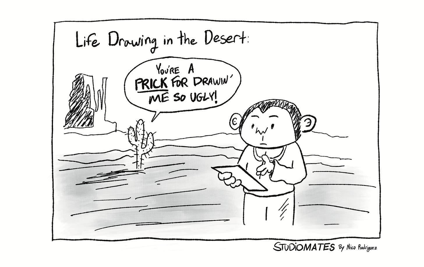 I walk the desert hoping for a moment of peace and quiet. Instead, the clouds attack me with rain, and I no longer feel the love from the spry cacti posted up throughout the sea of tan. A golden texture crumbles under my feet every time I step forward, and when I retrace my steps, I tangle on a wiry web of dry bush. A fire in the sky calls to me. It gives my face and neck a tomato-red love tap. Maybe the sun loves me. Maybe I should accept and nurture the blinding light that is locked and loaded like a tank cannon. Stare down the barrel. Make it hurt. I see a drop of water on a slab of green snuggled next to a decent sized rock. It’s the perfect scene to paint…
