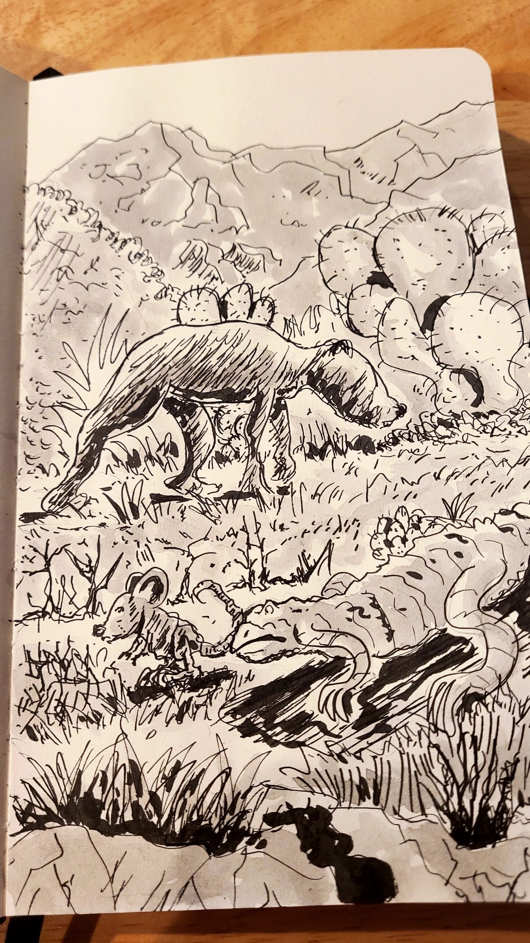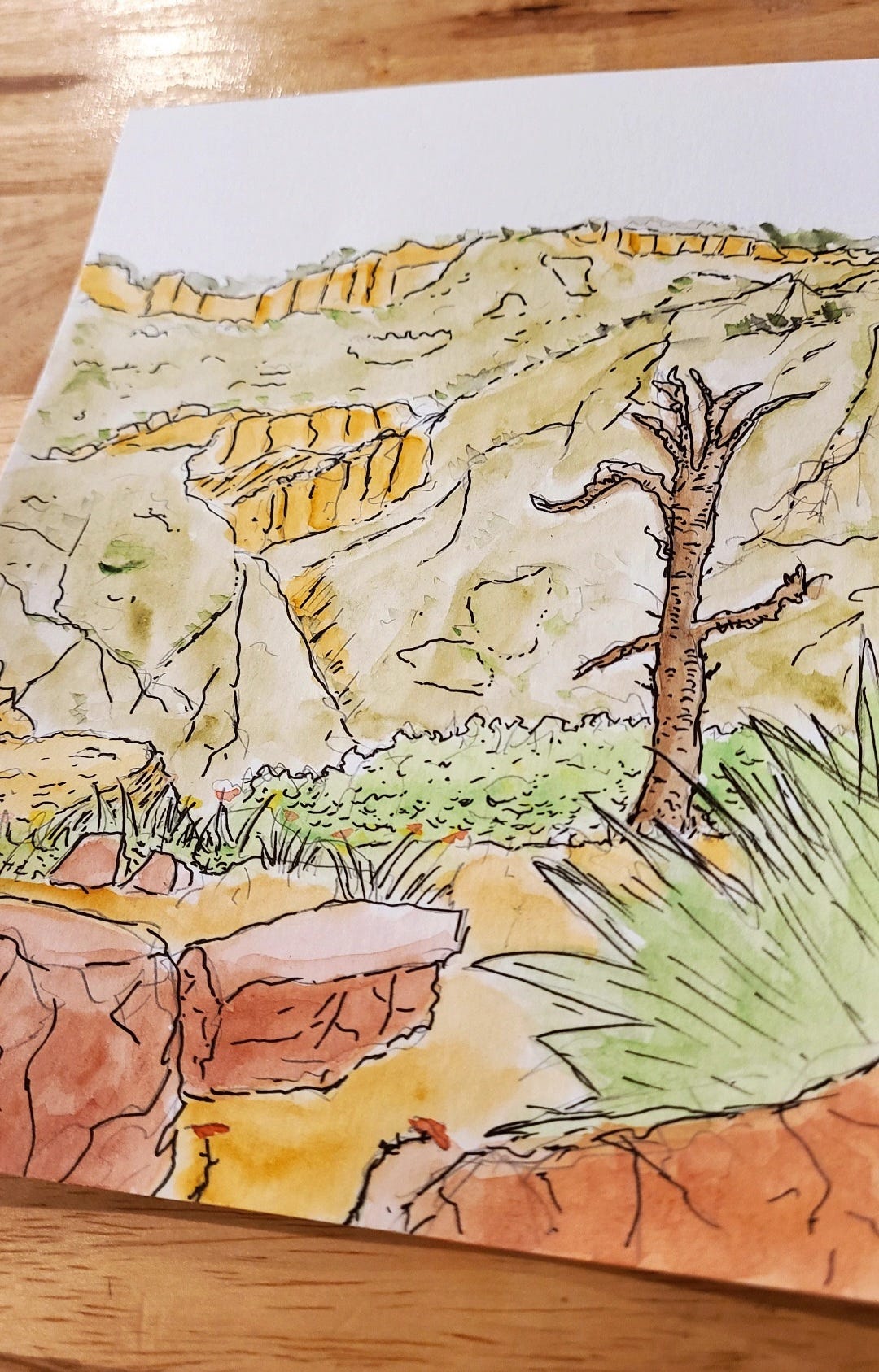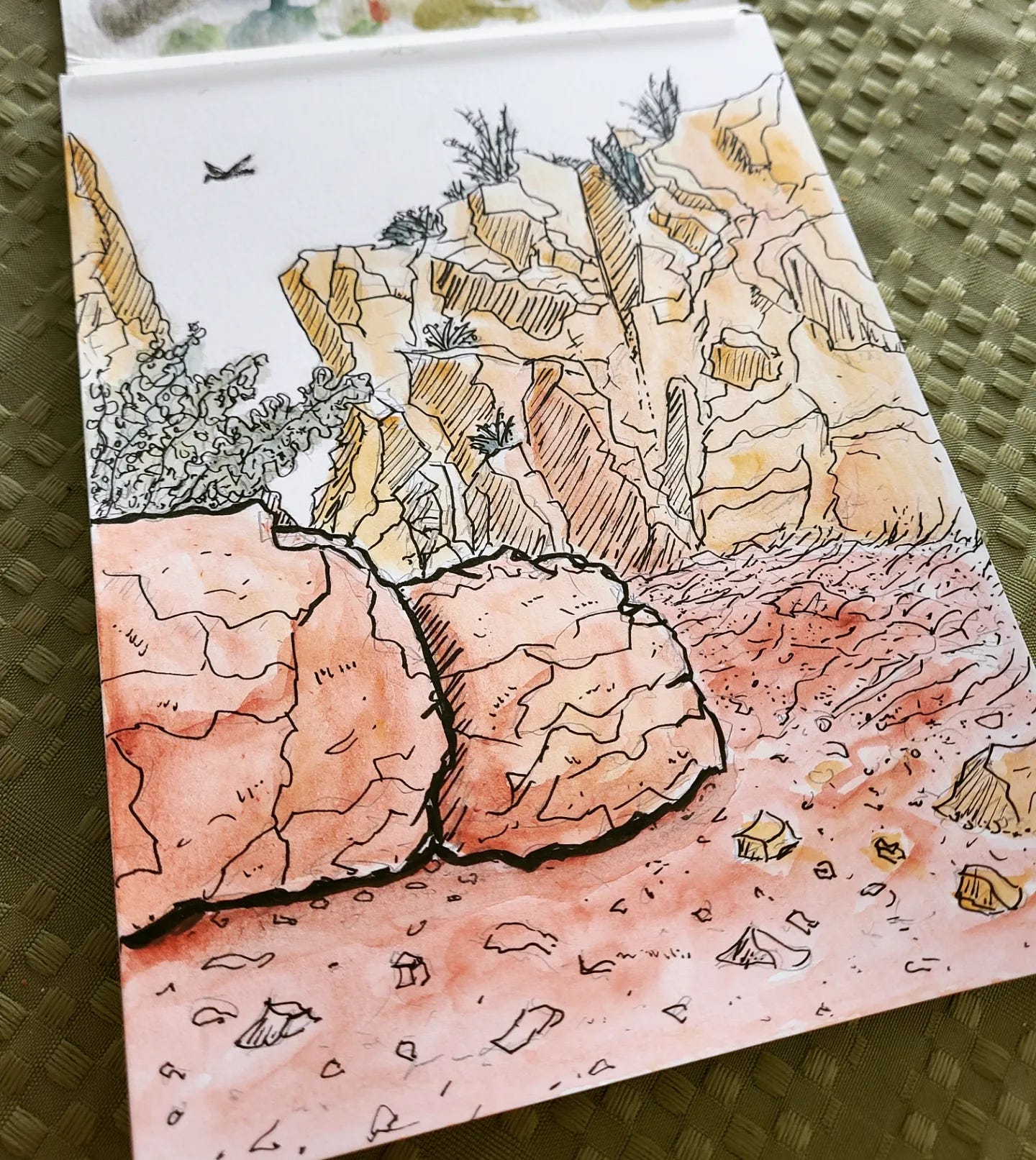 My trip to Big Bend National Park was fantastic. It was great being in a remote location where the night sky was littered with stars. The sheer number of interesting plants and cacti is something that is truly missed living in the city. Oh, and the land critters at Big Bend are much more exotic than the Texas sized cockroaches that I see running the streets of Houston. I couldn’t help but to be inspired by all the wonderful views and managed to do some sketching and painting throughout the trail hikes. Here’s a few sketches: