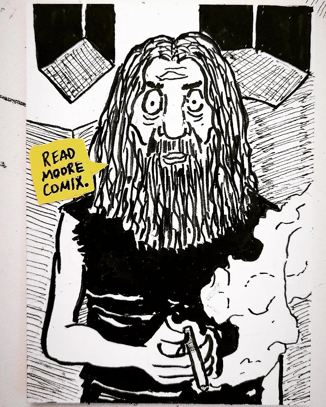 I’ll leave you with this sketch card of Alan Moore, trailblazing comic book writer turned real life magician, and a new article that discusses his outlook on comics and movies. Read it or he will come looking for you.