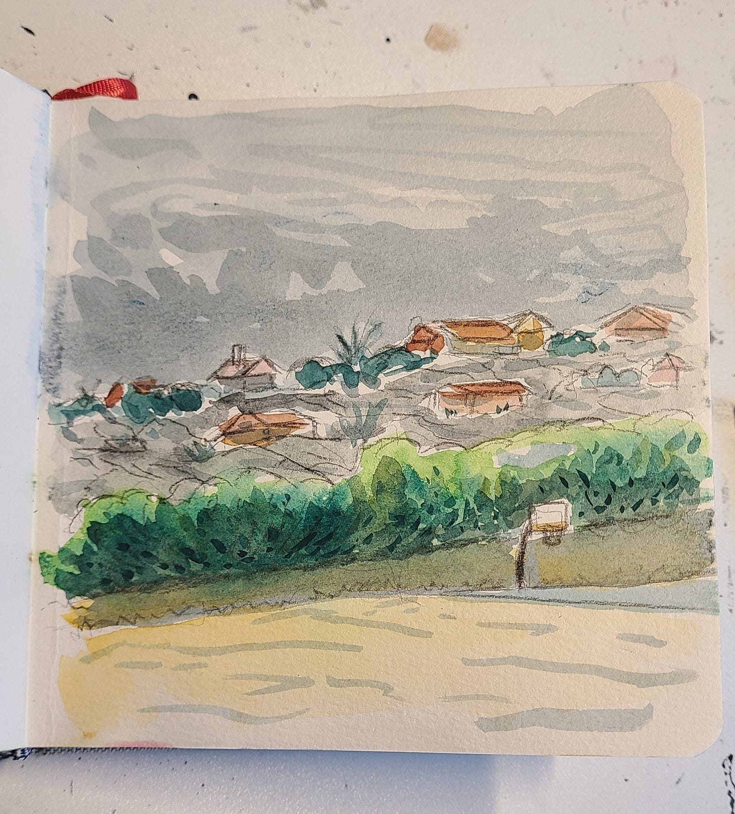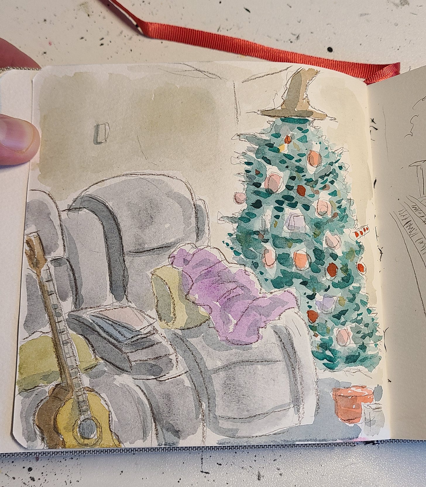 I’m about halfway through my “Polaroid” sketchbook. I’m still loving this thing. It’s the perfect size for painting memorable moments. Some scenes are visually interesting; some are just capturing everyday life. Here are a few of my favorites.