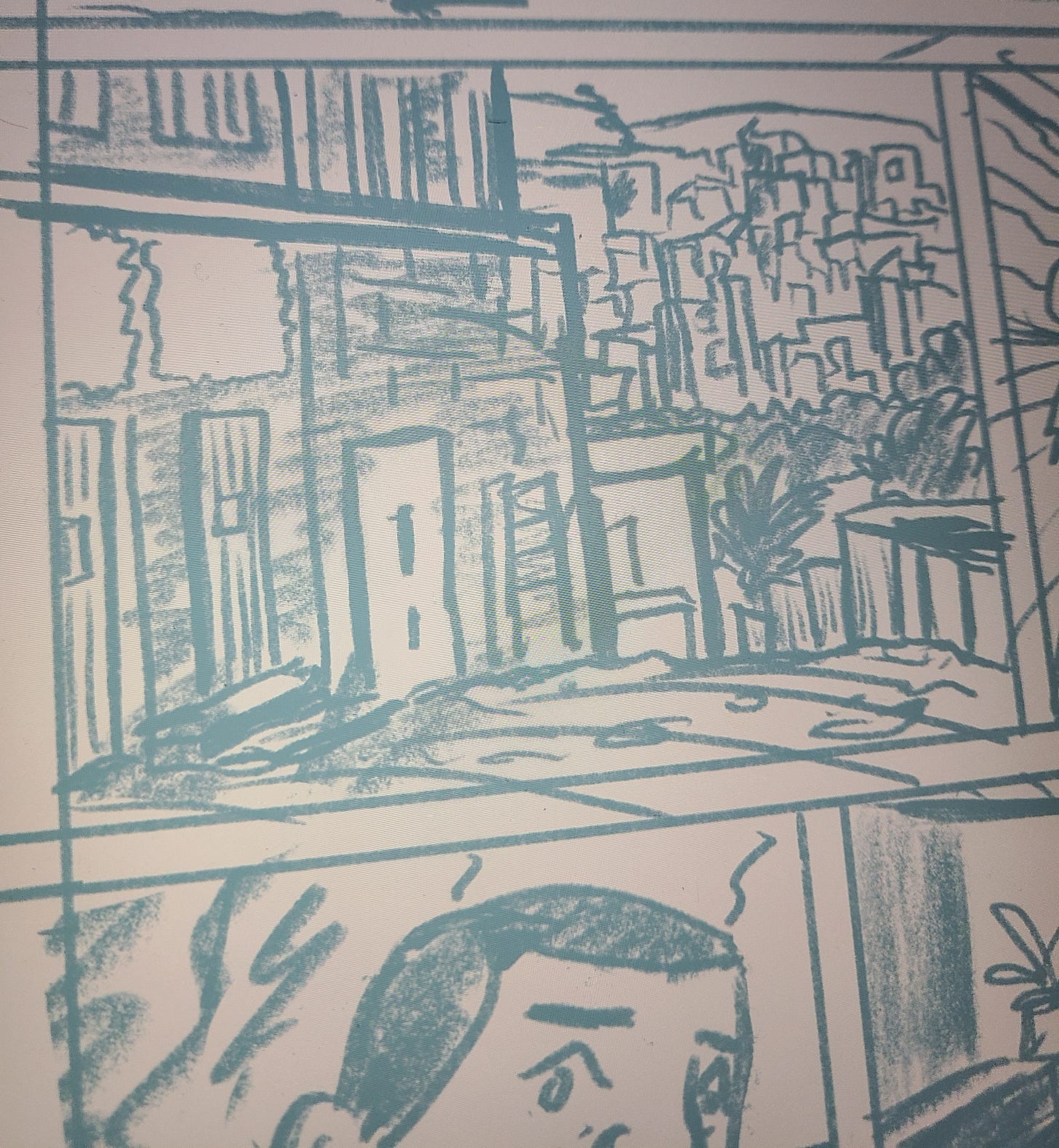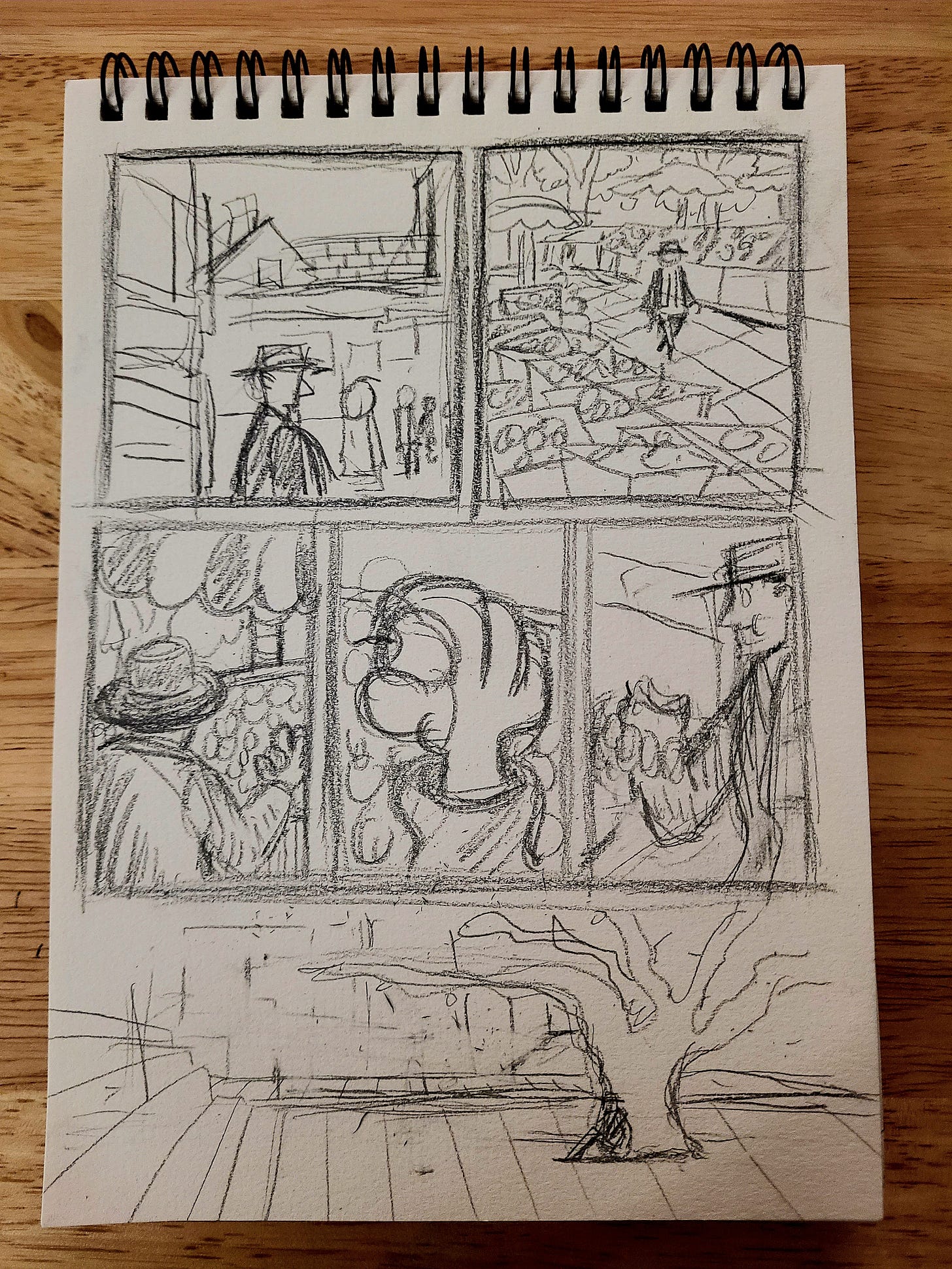 And here are pencils for a random sketchbook comic about a man walking to the market and grabbing an apple. A fun, Sunday kinda warm-up.