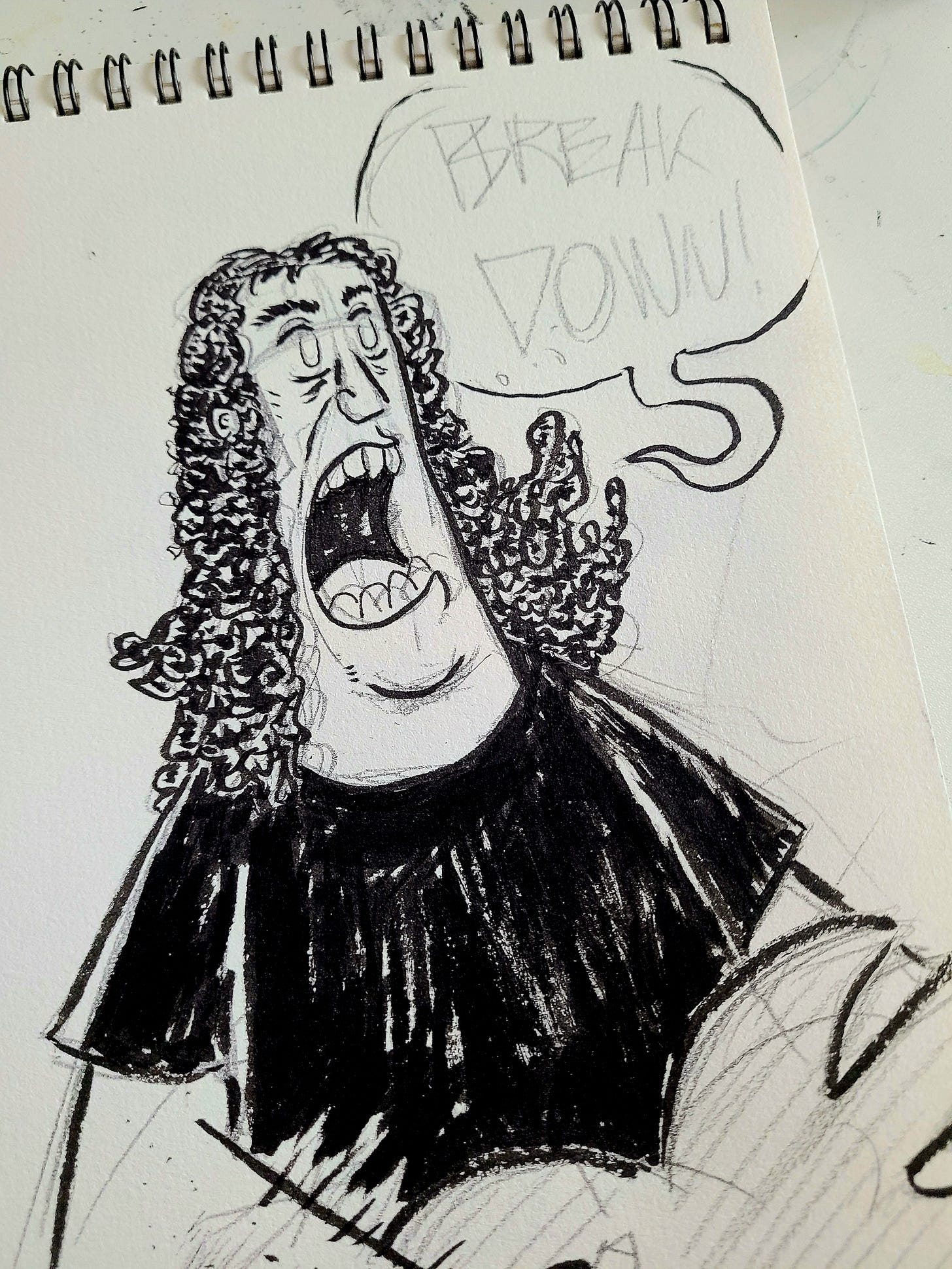 Here’s a funky metalhead guy that I started in the sketchbook. I like his exaggerated shape. I’m still deciding if I want to throw paint on the sketch or scan it in and play with some digital color.