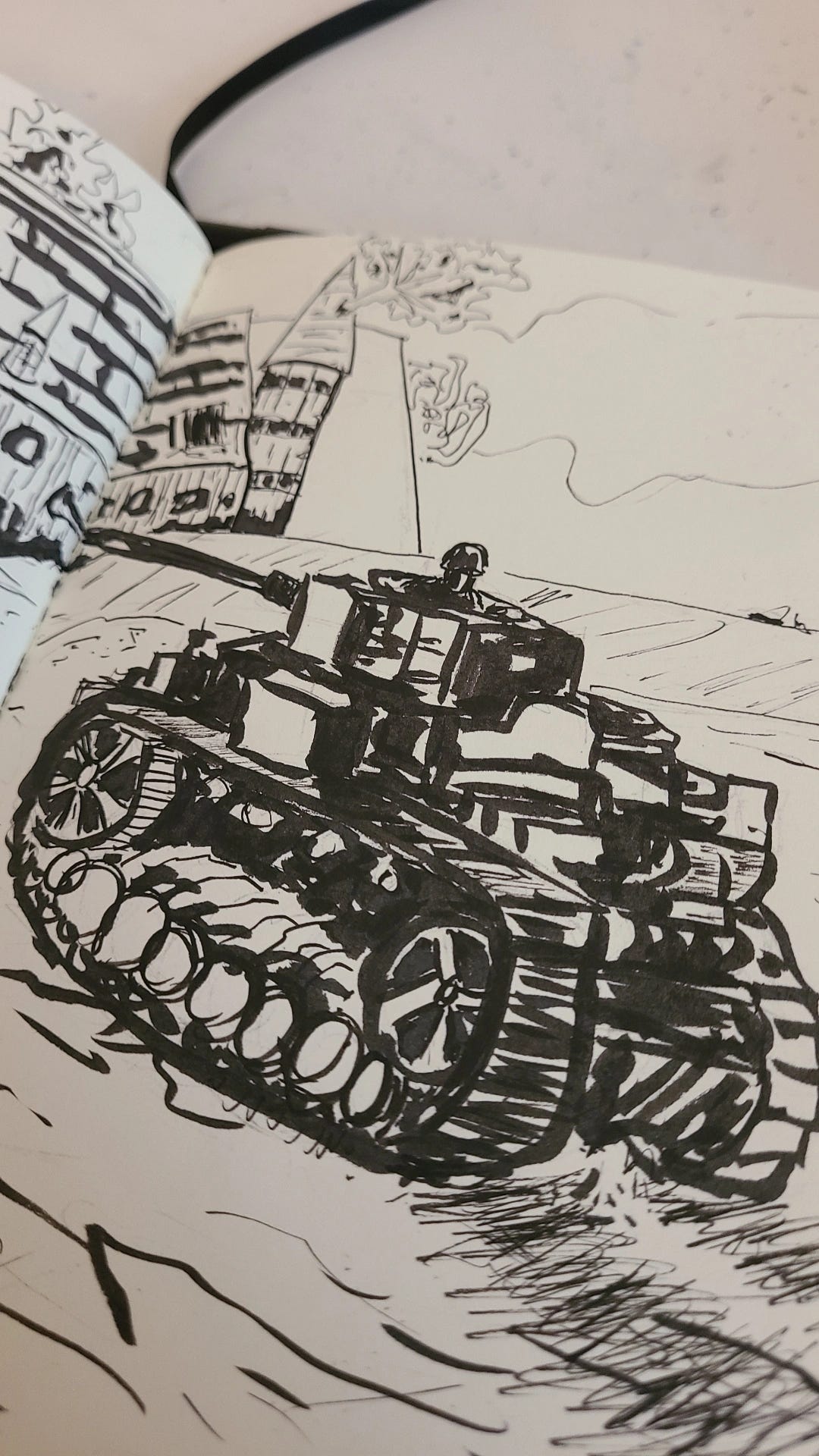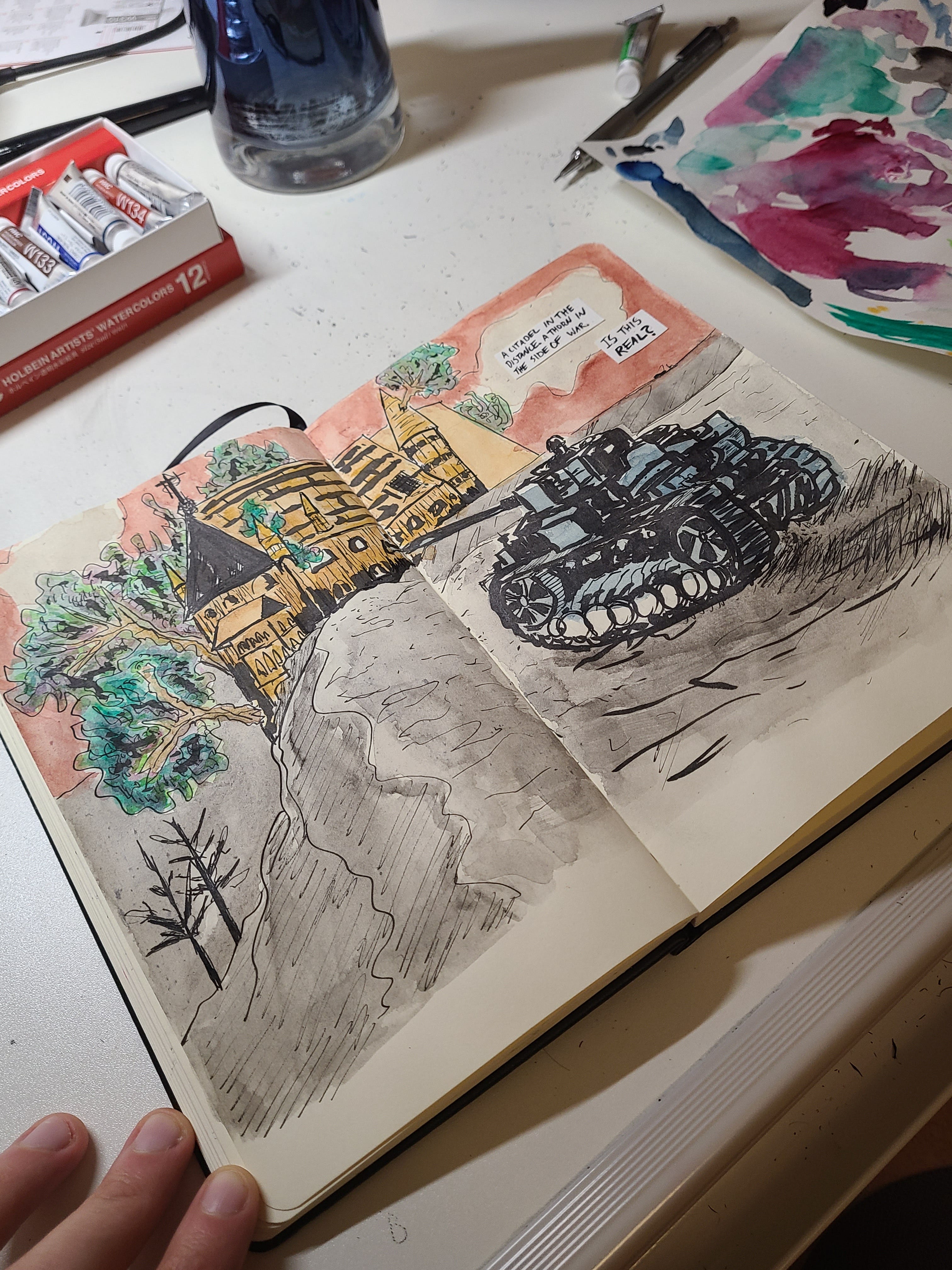 Here’s a piece that I did in my sketchbook this weekend which uses all of the tools that I mentioned above. You can see that the tank is bolder and interlaced with heavier black, done with the Pentel pocket brush. I used the Zebra pens for the citadel and trees, then the liners for the other background components. I didn’t go too heavy with the blacks so that I could pull everything together with the watercolor.