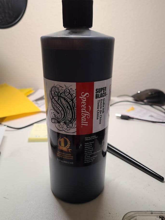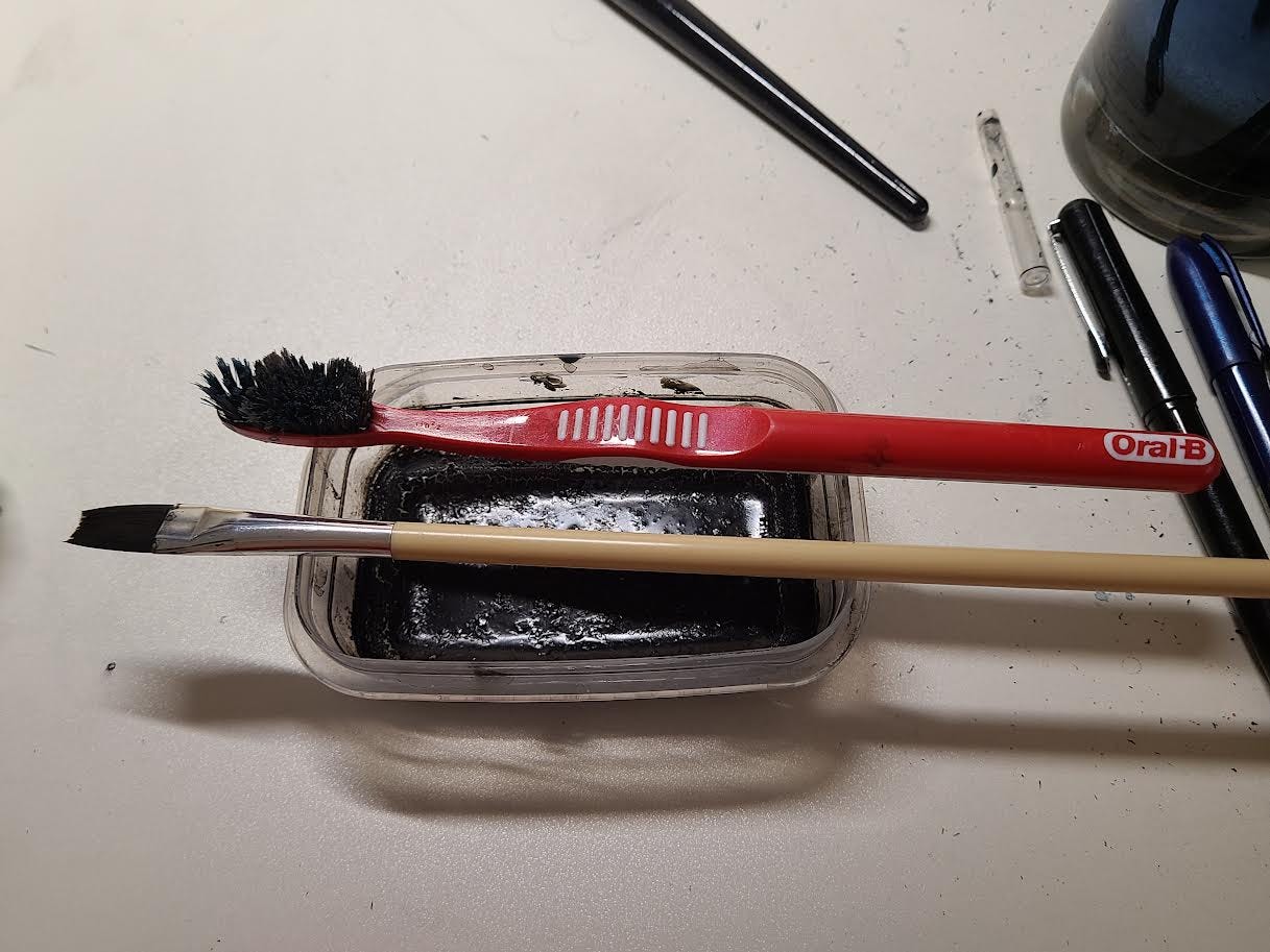 This speed ball ink is used for spotting heavy blacks. It’s not my favorite ink, but it gets the job done in place of using my pocket brush. Quantity over quality with this one. Also, there’s a cheap ink brush that is amazing and an old toothbrush for weird texture and splatters. Yes, I am covered in ink most of the time when using these.