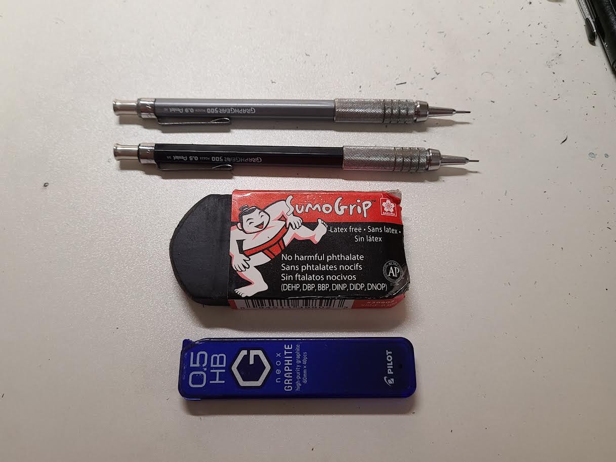 I’ve stuck with this pencil since day 1 of making comics and it hasn’t failed me yet. Both Pentel, one is 0.5 lead, and the other is 0.9. I like these drafting mechanical pencils because I can get down in the details without having to sharpen every few strokes. The Sumo eraser is a beast and a blessing on 11 x 17 boards.